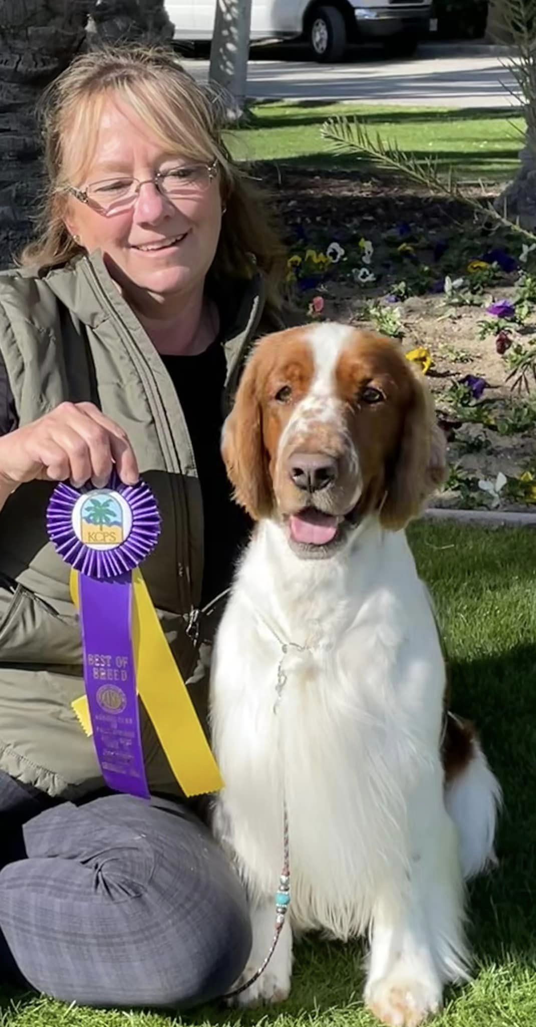 Baloo – GCHB CH Rocksprings The Bare Necessities is our other dog. He is a “bronze” grand champion and has been shining in the conformation ring. He has produced some beautiful puppies. We are excited to have him in the Fox River Family with his puppies. This is Kit, his owner.