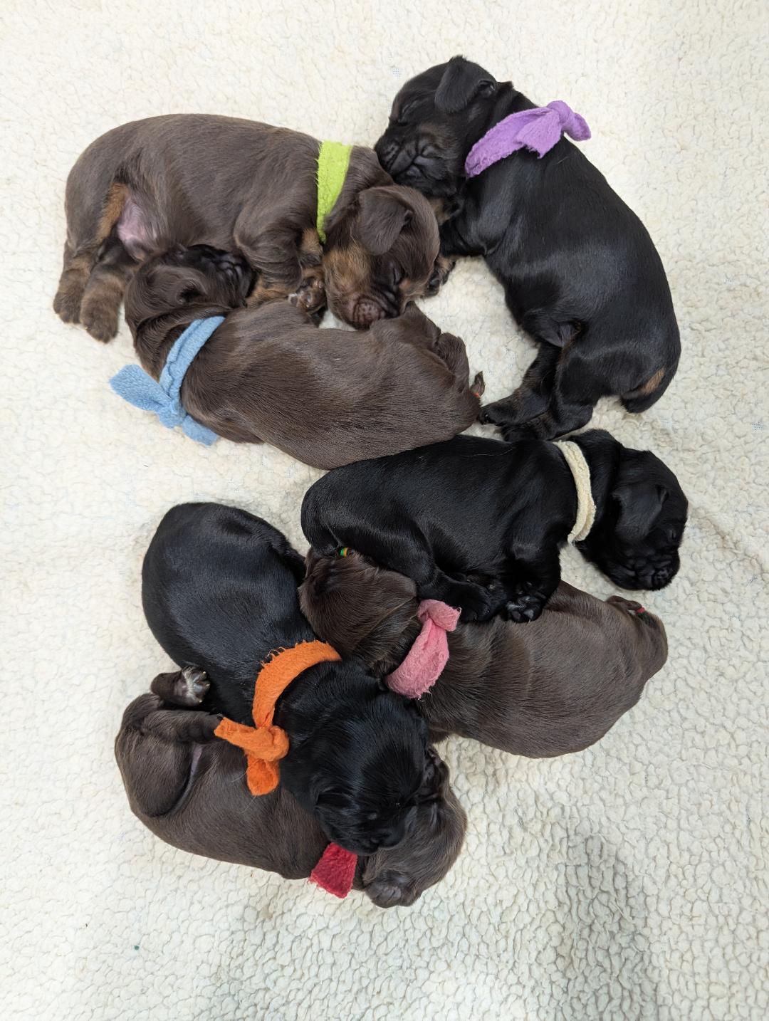 A much-awaited litter arrived January 10th, 2022. Our beautiful liver and tan girl, Quincy, whelped six adorable puppies out of GCH CH Dicken’s Bayham Badger – Badger. And they are all solid liver! The litter theme is “Chocolate Candy.” The four boys are Rolo (green), Heath (blue), Twix (orange) and Snicker (red). The two girls are Tootsie (pale pink) and Coco (dark pink).
