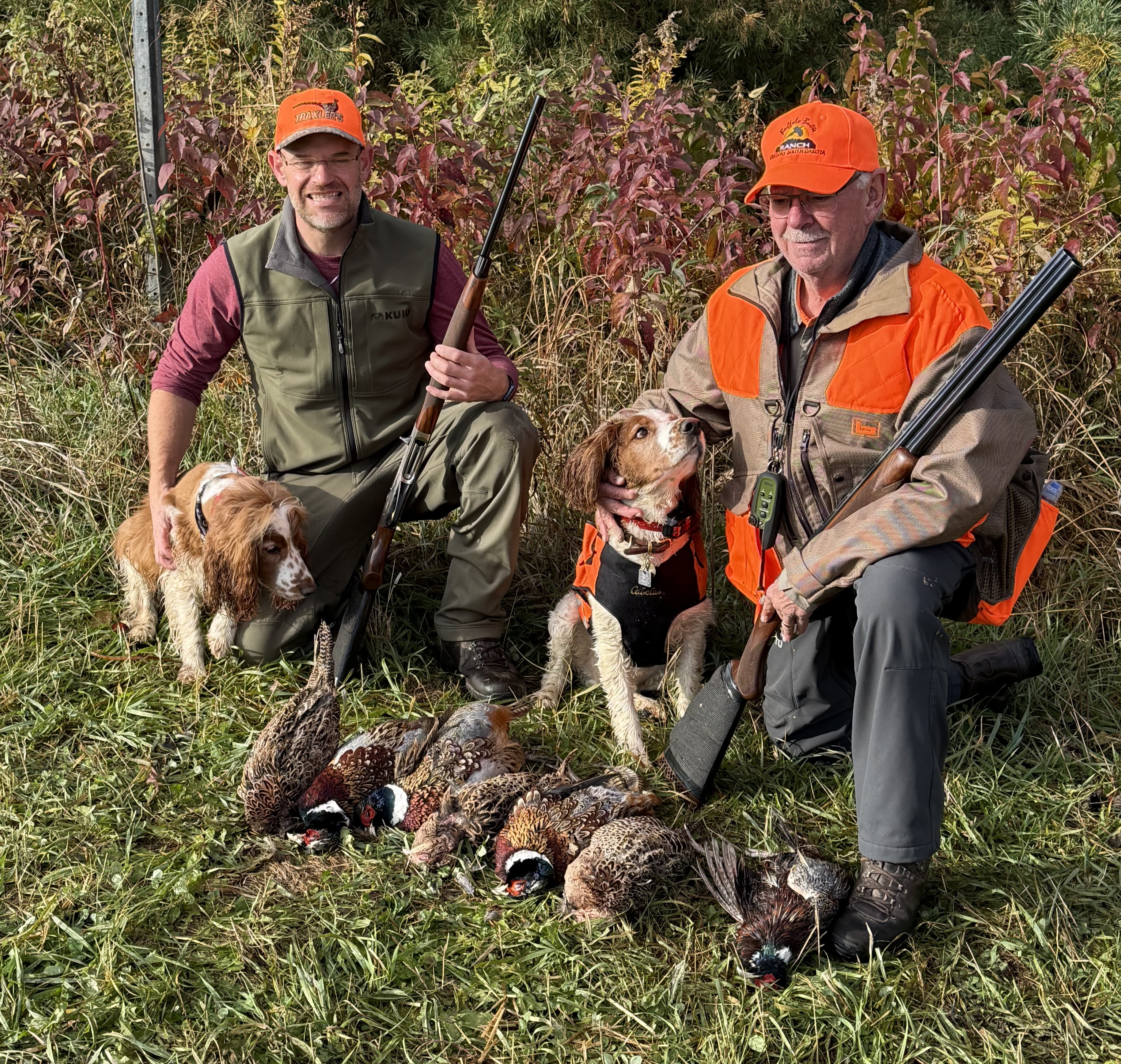 Owner/handler Rick and his beautiful red and white dog, Duffy, just came back from hunting in South Dakota. Rick writes “I’ve been hunting pheasants for 60 years. These two Welshies quarter better than any two dogs I’ve ever hunted with. Duffy made all 7 retrieves in one hour!” High praise! Love to see the Welshies out in the field doing what they were originally bred for. Duffy and Rick on the right! Rick’s son Jeff and his dog Maverick.