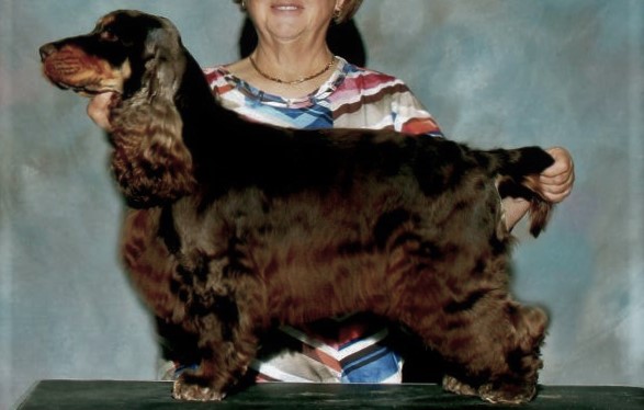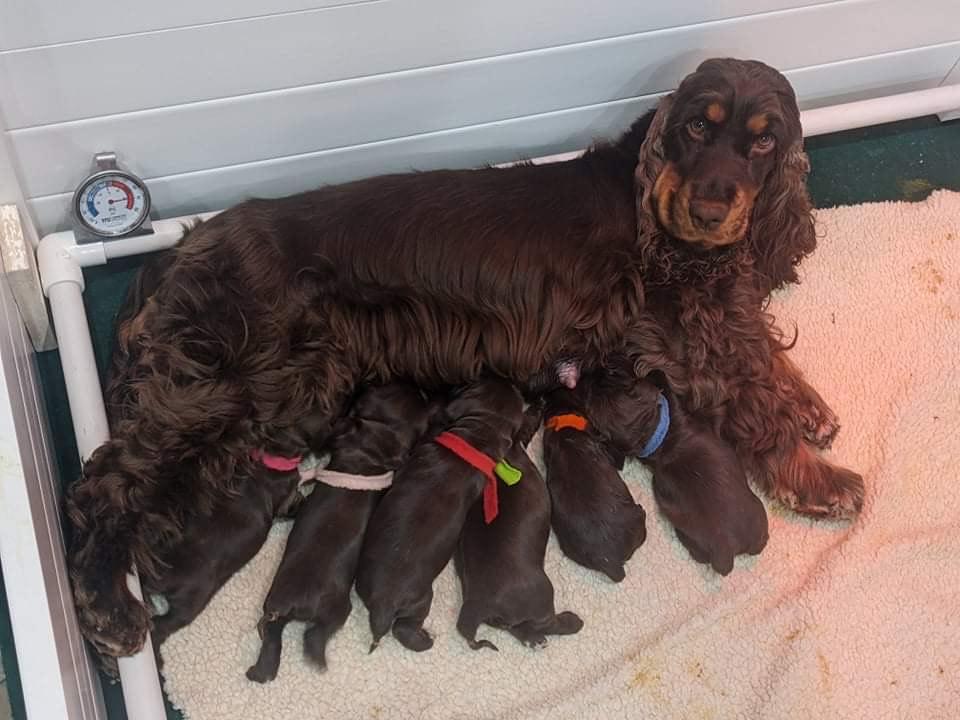 A long-time goal has been realized here at Fox River Spaniels. We’ve bred black, black and tan, red colored puppies, but never liver or liver and tan – all the solid colors English Cockers come in. Well, I can’t take credit for Quincy – a liver and tan. She was bred by Irmina at Kennel Modus Vivendi in Poland. I bred her to GCH CH Dicken’s Badger Bayham – Badger, a beautiful liver roan (parti-color) male. Two months later, January 10th, out popped six absolutely gorgeous solid liver puppies – 4 males and 2 females. All doing really well and Quincy has been the absolute best Mother you could hope for.