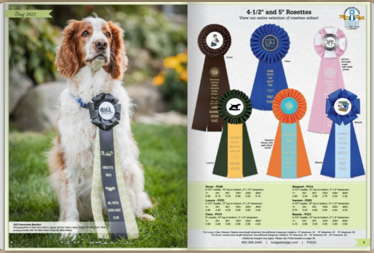 Here is Pete – Fox River Legacy Oh For Pete’s Sake RATCH, TGA, THDX, CGC – winning an Honorable Mention for the Hodges Badge Dog Show Catalog competition! Hodges makes these beautiful rosettes for competitions. The beautiful one around his neck was for earning his Barn Hunt Crazy 8. Pete has his RATCH – Barn Hunt Championship. Pete is the first Welsh Springer to earn this title in the United States. Super proud of Pete and his owner/handler Karen.