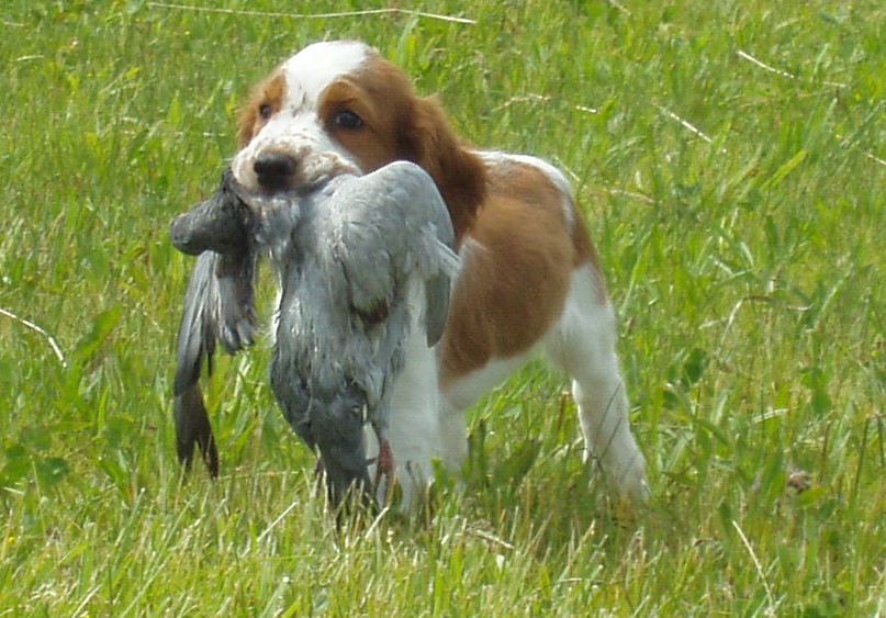 This picture to the left was taken by our daughter Amy, of Molly at nine weeks old retrieving a pigeon. She was attending a flushing spaniel hunting seminar with Obie and Lucy. Molly was the only Welshie there and also the youngest dog. Molly is very birdy and loves to hunt and loves to be outdoors. Molly is an excellent and well-rounded little girl with the sweetest personality; hence her name. December 2006 Molly was bred to Rolyart’s CH Don’s Full Fig –“Fig” a Swedish import.